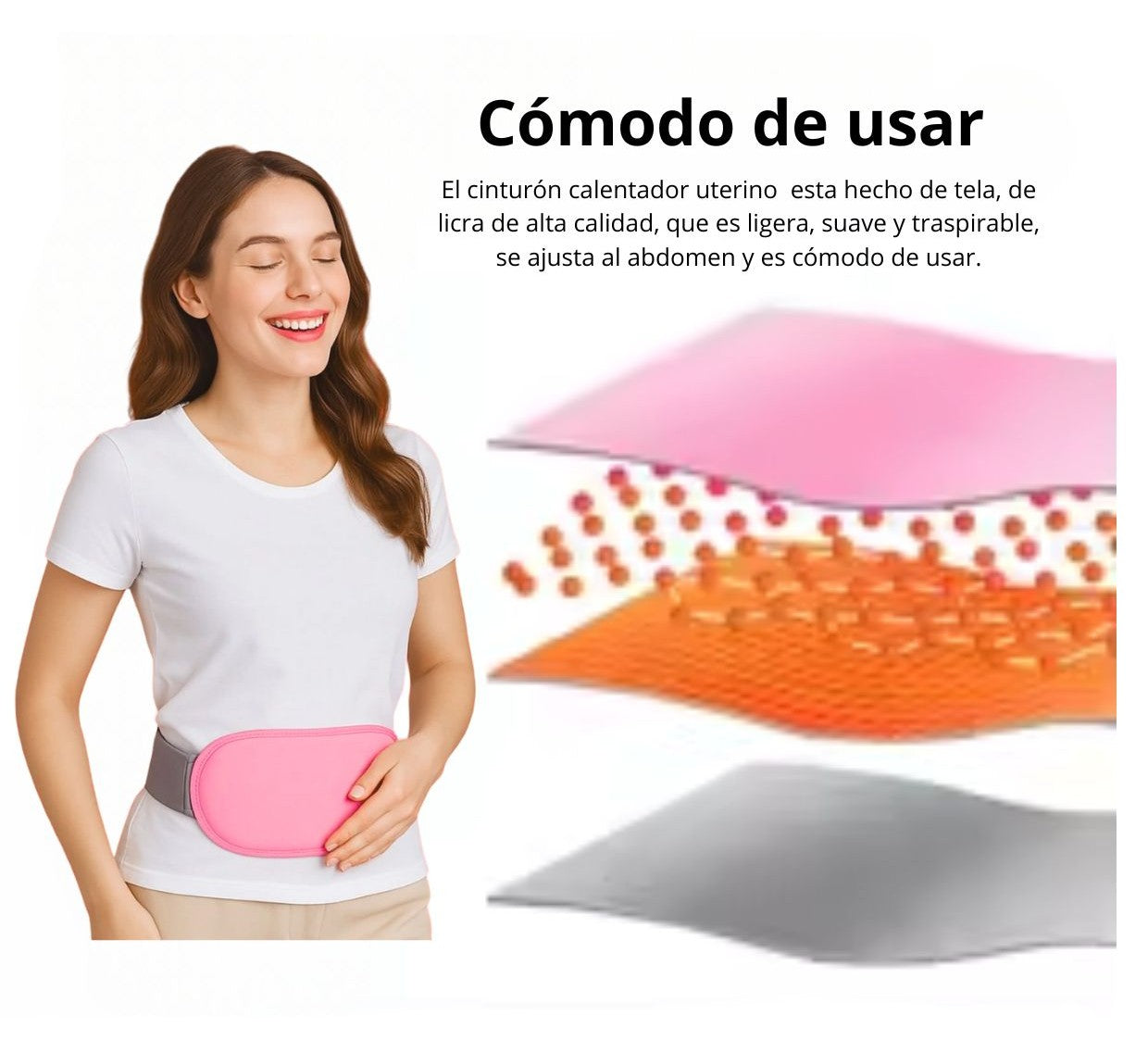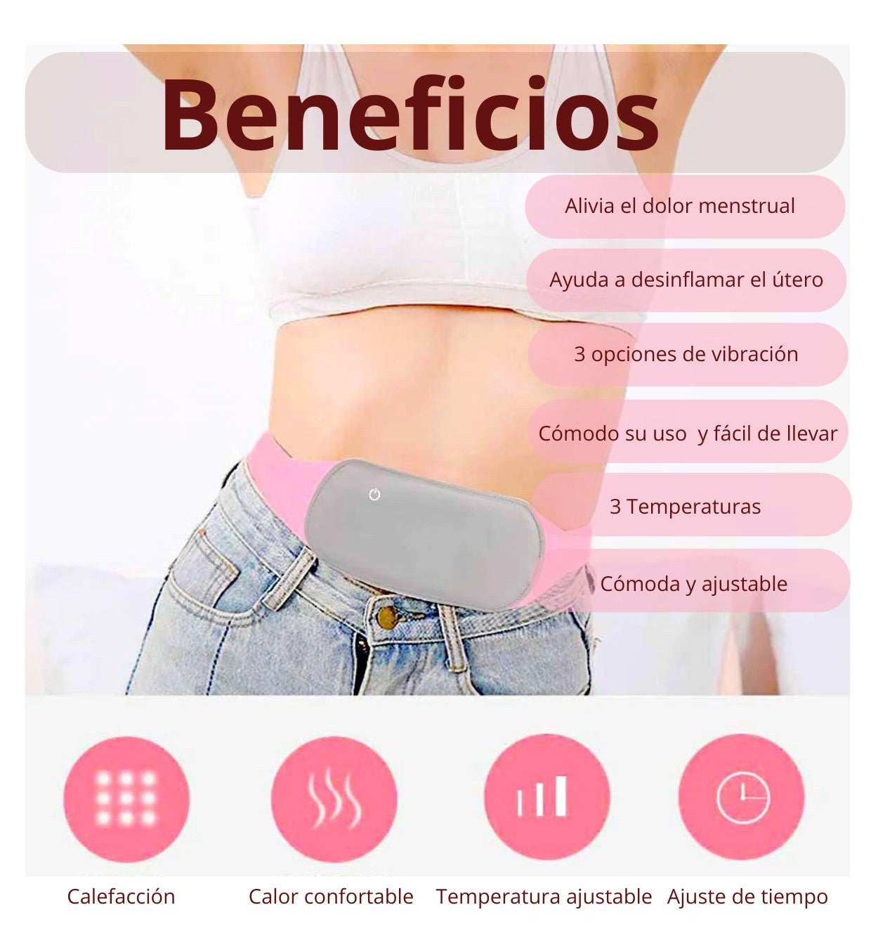 Este cinturón térmico o almohadilla térmica ayuda a aliviar el dolor, esta específicamente diseñado para cólicos menstruales y dolores abdominales o lumbares, utiliza calor y, en algunos casos, masajes en modo vibración para relajar los músculos y aliviar el malestar causado por los cólicos menstruales.